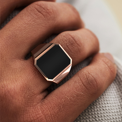 The solid Lars 4 signet ring with octagon onyx stone top, as shown above, is filled with tradition. Customary, the signet ring was passed down from father to son. Start your own tradition with this solid rose gold signet ring. We are also more than happy to engrave your ring with a monogram or family crest. Please check our database for further inquiries and options. You can find the departments of our education center at the bottom of this page. Start a new tradition with the classic rose gold Lars 4 signet ring. Our goldsmiths passionately create your customized signet ring to your liking with the utmost care. The rose gold signet ring, as shown here, can be customized using our online tool. Feel free to ask our jewel designers for assistance if you want changes made which are unavailable in our online tool. We are happy to answer your questions.Our team of talented, passionate designers add new ring designs to our online collection daily. Our objective in doing so, is to be able to offer you a wide variety of jewels. Please feel free to request a quote if you have specific wishes for your ring. We guarantee to make you an offer you can't refuse.Are you on a budget? Please feel free to contact us, so we can go discuss your options. We offer our rings at guaranteed best price, because we make them to order. You won't find such a price anywhere else!To make it easier for you, we offer a 30 day return policy. Check our terms and conditions.