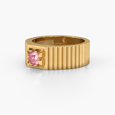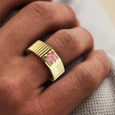 For the contemporary, stylish man that likes a bit of extravagance, we offer the heavy 14 Carat gold Elias pinky ring with pink lab grown diamond. Traditionally a pinky ring was worn as a sign of wealth. That is why a pink ring is perfectly suited for men who want to stand out. How do you like this modern gold men's ring? Simply customize this Elias men's ring, using our online tool. Subsequently, your personal best prices Elias men's ring will be made by hand by our goldsmiths. Precious metals and gemstones can be customized to your liking. Do you have specific preferences which are unavailable in our online tool? Please feel free to contact us. We will customize your personal modern men's ring to your liking.