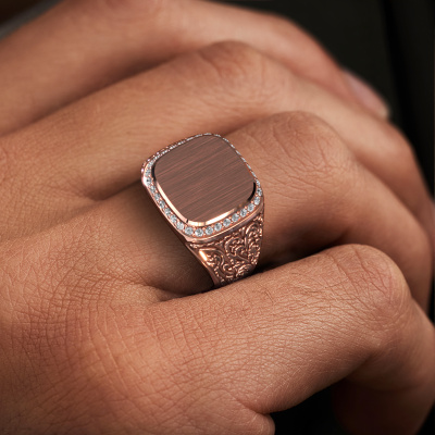 Dress to impress with this heavy Jesse 2 men's ring, because with the right ring you make a strong personal statement. This Jesse 2 special men's ring is shown in 14 Carat rose gold. If this doesn't suit your style, feel free to customize the precious metal to your liking. After all, you want a men's ring that matches your style. A ring that truly suits you. One saying: This is who I am!The best part of this special signet ring is that you can customize it to your own liking. Your style, your choice, your signet ring. On top of that, your vintage rose gold signet ring will be made by hand with eco-friendly materials! Please feel free to easily customize the ring, using our online tool. Of course, you can always contact us. We will gladly help you compiling your vintage signet ring. Is there a design you like, but you would like to customize it with a gemstone we do not offer on our website, then please contact us. We're happy to tell you about the possibilities.