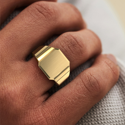 For any ring wearing individual who likes straight shapes, without too much embellishment, we offer the rectangular gold Abel 2 signet ring. This flat surfaced ring stands out with its tight, stylish design and is perfect for the contemporary, confident man. Do you prefer engraving of your edgy ring with a monogram or family seal? Please check our database for further inquiries and options. You can find the sections of our database at the bottom of this page. The edgy Abel 2 signet ring, as shown here, can be customized to your liking. Our online tool offers many different options but please feel free to contact us if you want changes made to your Abel 2 signet ring, which are unavailable in our online tool.Our talented designers add new designs to our online collection daily. Together they create a diverse collection of the finest jewelry. If you prefer to make a ring according your own design, please feel free to request a quote. We will make you an amazing offer, based on quality and price.Are you on a budget? Please feel free to contact us, so we can go discuss your options. We offer our rings at guaranteed best price, because we make them to order. You won't find such a price anywhere else!To make it easier for you, we offer a 30 day return policy. Check our terms and conditions.