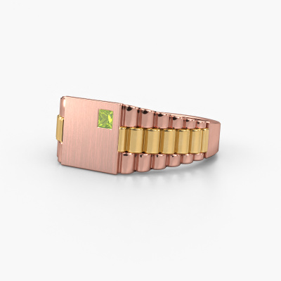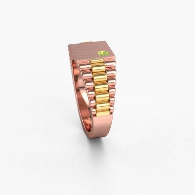 Everyone knows the design of this well-known watch brand. With two colors of rose gold links, this solid 14 Carat rose gold Pelle men's ring, is perfectly suited for trendy, successful men. A man who wants to dress to impress with a striking men's ring with 3 mm peridot. Show them what you are made of!The best part of this royal men's ring is that you can customize it to your own liking. Your style, your choice, your men's ring. On top of that, your luxury rose gold men's ring will be made by hand with eco-friendly materials! Please feel free to easily customize the ring, using our online tool. Of course, you can always contact us. We will gladly help you compiling your luxury men's ring. Is there a design you like, but you would like to customize it with a gemstone we do not offer on our website, then please contact us. We're happy to tell you about the possibilities.Our team of talented, passionate designers add new ring designs to our online collection daily. Our objective in doing so, is to be able to offer you a wide variety of jewels. Please feel free to request a quote if you have specific wishes for your ring. We guarantee to make you an offer you can't refuse.After receiving your order, our goldsmiths will start the creative process of making your Pelle ring. We don't keep stock. This is advantageous because these costs will not be passed on to you. Therefore, we can offer jewelry at exceptionally low prices.To make it easier for you, we offer a 30 day return policy. Check our terms and conditions.