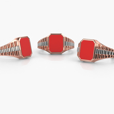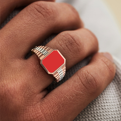 Everyone knows the design of this well-known watch brand. With two colors of rose gold links, this rectangular 14 Carat rose gold Brent 1 signet ring, is perfectly suited for trendy, successful men. A man who wants to dress to impress with a striking signet ring with 10x8 mm red enamel. Show them what you are made of!Customize your own royal Brent 1 signet ring, which will then be created by our goldsmiths with great passion. Do you prefer a different option than is shown here in the rose gold Brent 1 signet ring? Then our online tools offers various options. Feel free to ask us for help if you are unable to succeed. We are happy to answer your questions!New jewelry designs are added to our online collection daily. Our team of passionate designers strive to create extraordinary and diverse designs. Have you seen a ring you like? Please feel free to contact us. Based on a good price/ quality ratio, we will make you an offer you can't refuse!By using our modern techniques, we can design and customize the finest quality jewels with the utmost care for you. Our rings are always priced 30 percent lower than other jewelers. We make rings to order, so we don't have to maintain a large stock. If you have a certain budget, we are more than happy to advice you accordingly.To make it easier for you, we offer a 30 day return policy. Check our terms and conditions.