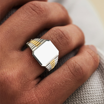 Everyone knows the design of this well-known watch brand. With two colors of white gold links, this flat 14 Carat white gold Brent 2 signet ring, is perfectly suited for trendy, successful men. A man who wants to dress to impress with a striking signet ring with 12x10 mm white enamel. Show them what you are made of!Customize your own special Brent 2 signet ring, which will then be created by our goldsmiths with great passion. Do you prefer a different option than is shown here in the white gold Brent 2 signet ring? Then our online tools offers various options. Feel free to ask us for help if you are unable to succeed. We are happy to answer your questions!