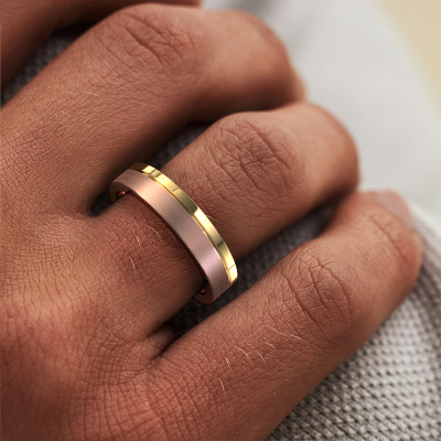 This stunning combination of two precious metals truly symbolizes the special bond between two people! And that is what makes this WH0300M15BPM ring a special wedding ring, a true symbol of your love! By using a combination of the most modern techniques and ancient crafting, our goldsmith will be able to create your rose gold men's wedding ring with great care. Resulting in a uniquely handmade ring, a sign of love! This modern WH0300M15BPM wedding ring with flat profile has an ±0.20 in (5 mm) width and has a mat/shiny finish. After designing your ring, our jewel designer will start working on it. He will make a graphic 3D design of your wedding ring. This can also be used to make a dummy ring. Simply order a dummy ring and see for yourself how your ring will turn out. Subsequently, our expert goldsmith will create your ring in our own artisan studio. We use eco-friendly gold, so you get a ring, we are proud of, which looks good inside and out. You can also send us your own gold. Because we create your ring by hand, we can use your own gold. Our goal is to create an exquisite sparkling wedding ring just as envisioned it!Be inspired by our designs, and adjust this wedding ring to your own personal taste: wider or smaller, shiny or matte? No problem! Even if you have ideas of your own for special wedding rings, our jewelry designers are lined up to help you design the ring of your dreams. don't hesitate to contact us!After receiving your order, our goldsmiths will start the creative process of making your wedding rings. We don't keep stock. This is advantageous because these costs will not be passed on to you. Therefore, our quality wedding rings are always priced 30 percent lower than those of other jewelers.To make it easier for you, we offer a 30 day return policy. Check our terms and conditions.