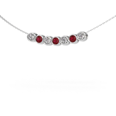 At DiamondsByMe, we create exclusive, extraordinary jewels. We use nothing but the finest precious metals and birthstones. This white gold necklace is a true work of art! Patiently and passionately created to perfection by our goldsmith. The meticulous crafting of this ring requires a keen eye and skilled hand. And that is exactly what excites our goldsmiths! This fashionable extraordinary, exclusive pendant is proof of that. For maximum shine, these exquisite ruby are set by hand. This gives your necklace a glamorous appearance. The white gold Kim 7 necklace, as shown above, is set with round ruby. What could possibly be more beautiful than a personally designed fashionable necklace, handmade by yours truly? Please, feel free to customize each model by choosing different precious metals and gemstones. This makes your necklace truly unique. This necklace can be customized to your liking. It goes without saying that you can also ask us for help. We are more than willing to assist in designing your Kim 7 fashionable necklace. If you like but still have specific wishes concerning customizing your design, such as adding a gemstone which isn't mentioned in the list, feel free to contact us. We will gladly inform you on different options.Our team of talented, passionate designers add new necklace designs to our online collection daily. Our objective in doing so, is to be able to offer you a wide variety of jewels. Please feel free to request a quote if you have specific wishes for your necklace. We guarantee to make you an offer you can't refuse.By using a combination of the latest modern techniques, combined with ancient crafting, we can make all our necklaces in our own studio. Each jewel is made to order. This is advantageous because we can offer you a price you won't find anywhere else.To make it easier for you, we offer a 30 day return policy. Check our terms and conditions.