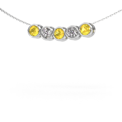How would you describe your style? Do you like things slightly different? At the very least, this elegant platinum necklace Kim 5 is unique, made especially by jewel designers. Our goldsmith will create your pendant to perfection by hand in our own artisan studio. This fashionable necklace is set with a yellow sapphire. These yellow sapphire are selected with great care because we believe your elegant necklace should be adorned with nothing less than the finest gemstones available. Wouldn't you agree?What could possibly be more beautiful than a personally designed fashionable necklace, handmade by yours truly? Please, feel free to customize each model by choosing different precious metals and gemstones. This makes your necklace truly unique. This necklace can be customized to your liking. It goes without saying that you can also ask us for help. We are more than willing to assist in designing your Kim 5 fashionable necklace. If you like but still have specific wishes concerning customizing your design, such as adding a gemstone which isn't mentioned in the list, feel free to contact us. We will gladly inform you on different options.
