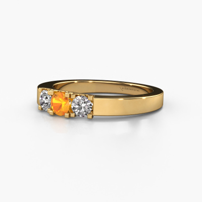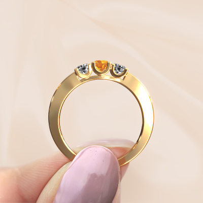 This extraordinary ring is called Selina 1. This type of ring is known as a memoire ring, because its gemstones are set in a continuous line. This makes it easy to combine with other rings. The band of this 14 Carat gold ring is set in a combination of citrin and diamond 3.7 mm. You can easily choose the combination you prefer online. As you can see, a single citrin is set in this single alliance gold ring. The memoire ring represents collaboration. And that is precisely what these gemstones do, collaborate. Together they add a beautiful effect to the band of a modern ring! Such a meaningful ring, wouldn't you agree? All of our hand selected citrin are positioned by hand by our expert goldsmith. It's a precise task, which can only be completed successfully through the combination of pure craftsmanship and usage of the latest techniques which give it an optimal effect. To create a perfect reflection of light, all the gemstones have to be perfectly aligned in the same way. During manufacturing, the expert goldsmith will therefore monitor the reflection of light constantly to check whether the citrin are aligned properly. This requires a skilled hand and a lot of patience but then the end product will be a true piece of art. And that is our mission!By using our modern techniques, we can design and customize the finest quality jewels with the utmost care for you. Our rings are always priced 30 percent lower than other jewelers. We make rings to order, so we don't have to maintain a large stock. If you have a certain budget, we are more than happy to advice you accordingly.New jewelry designs are added to our online collection daily. Our team of passionate designers strive to create extraordinary and diverse designs. Have you seen a ring you like? Please feel free to contact us. Based on a good price/ quality ratio, we will make you an offer you can't refuse!To make it easier for you, we offer a 30 day return policy. Check our terms and conditions.