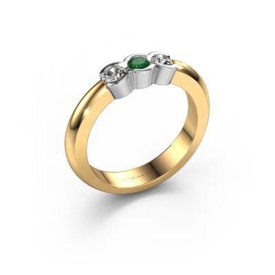 This extraordinary ring is called Lotte 3. This type of ring is known as a memoire ring, because its gemstones are set in a continuous line. This makes it easy to combine with other rings. The band of this 14 Carat gold ring is set in a combination of emerald and diamond 3 mm. You can easily choose the combination you prefer online. As you can see, a single emerald is set in this single alliance gold ring. The memoire ring represents collaboration. And that is precisely what these gemstones do, collaborate. Together they add a beautiful effect to the band of a modern ring! Such a meaningful ring, wouldn't you agree? All of our hand selected emeralds are positioned by hand by our expert goldsmith. It's a precise task, which can only be completed successfully through the combination of pure craftsmanship and usage of the latest techniques which give it an optimal effect. To create a perfect reflection of light, all the gemstones have to be perfectly aligned in the same way. During manufacturing, the expert goldsmith will therefore monitor the reflection of light constantly to check whether the emeralds are aligned properly. This requires a skilled hand and a lot of patience but then the end product will be a true piece of art. And that is our mission!By using a combination of the latest modern techniques, combined with ancient crafting, we can make all our rings in our own studio. Each jewel is made to order. This is advantageous because we can offer you a price you won't find anywhere else.Our team of talented, passionate designers add new ring designs to our online collection daily. Our objective in doing so, is to be able to offer you a wide variety of jewels. Please feel free to request a quote if you have specific wishes for your ring. We guarantee to make you an offer you can't refuse.To make it easier for you, we offer a 30 day return policy. Check our terms and conditions.