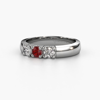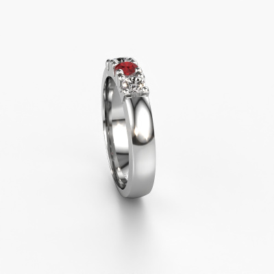 This extraordinary ring is called Rianne 3. This type of ring is known as a memoire ring, because its gemstones are set in a continuous line. This makes it easy to combine with other rings. The band of this platinum ring is set in a combination of ruby and diamond 3.4 mm. You can easily choose the combination you prefer online. As you can see, a single ruby is set in this single alliance platinum ring. The memoire ring represents collaboration. And that is precisely what these gemstones do, collaborate. Together they add a beautiful effect to the band of a classic ring! Such a meaningful ring, wouldn't you agree? All of our hand selected ruby are positioned by hand by our expert goldsmith. It's a precise task, which can only be completed successfully through the combination of pure craftsmanship and usage of the latest techniques which give it an optimal effect. To create a perfect reflection of light, all the gemstones have to be perfectly aligned in the same way. During manufacturing, the expert goldsmith will therefore monitor the reflection of light constantly to check whether the ruby are aligned properly. This requires a skilled hand and a lot of patience but then the end product will be a true piece of art. And that is our mission!After receiving your order, our goldsmiths will passionately start the creative process of making your ring in our own studio. Because we don't have a big stockpile, these costs will not be passed on to you. Our pricing is proof of that! We offer top quality jewels at lowest price, guaranteed.Our team of talented, passionate designers add new ring designs to our online collection daily. Our objective in doing so, is to be able to offer you a wide variety of jewels. Please feel free to request a quote if you have specific wishes for your ring. We guarantee to make you an offer you can't refuse.To make it easier for you, we offer a 30 day return policy. Check our terms and conditions.