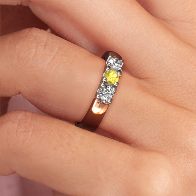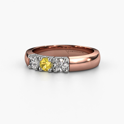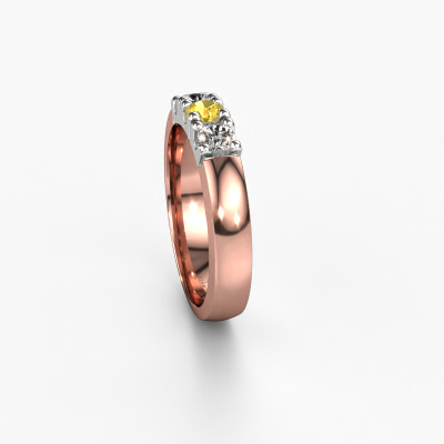 This extraordinary ring is called Rianne 3. This type of ring is known as a memoire ring, because its gemstones are set in a continuous line. This makes it easy to combine with other rings. The band of this 14 Carat rose gold ring is set in a combination of yellow sapphire and diamond 3.4 mm. You can easily choose the combination you prefer online. As you can see, a single yellow sapphire is set in this single alliance rose gold ring. The memoire ring represents collaboration. And that is precisely what these gemstones do, collaborate. Together they add a beautiful effect to the band of a classic ring! Such a meaningful ring, wouldn't you agree? All of our hand selected yellow sapphire are positioned by hand by our expert goldsmith. It's a precise task, which can only be completed successfully through the combination of pure craftsmanship and usage of the latest techniques which give it an optimal effect. To create a perfect reflection of light, all the gemstones have to be perfectly aligned in the same way. During manufacturing, the expert goldsmith will therefore monitor the reflection of light constantly to check whether the yellow sapphire are aligned properly. This requires a skilled hand and a lot of patience but then the end product will be a true piece of art. And that is our mission!After receiving your order, our goldsmiths will passionately start the creative process of making your ring in our own studio. Because we don't have a big stockpile, these costs will not be passed on to you. Our pricing is proof of that! We offer top quality jewels at lowest price, guaranteed.Our team of talented, passionate designers add new ring designs to our online collection daily. Our objective in doing so, is to be able to offer you a wide variety of jewels. Please feel free to request a quote if you have specific wishes for your ring. We guarantee to make you an offer you can't refuse.To make it easier for you, we offer a 30 day return policy. Check our terms and conditions.