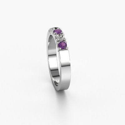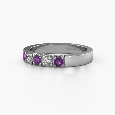 This extraordinary ring is called Dana 5. This type of ring is known as a memoire ring, because its gemstones are set in a continuous line. This makes it easy to combine with other rings. The band of this platinum ring is set in a combination of amethyst and diamond 3 mm. You can easily choose the combination you prefer online. As you can see, a single amethyst is set in this single alliance platinum ring. The memoire ring represents collaboration. And that is precisely what these gemstones do, collaborate. Together they add a beautiful effect to the band of a modern ring! Such a meaningful ring, wouldn't you agree? All of our hand selected amethysten are positioned by hand by our expert goldsmith. It's a precise task, which can only be completed successfully through the combination of pure craftsmanship and usage of the latest techniques which give it an optimal effect. To create a perfect reflection of light, all the gemstones have to be perfectly aligned in the same way. During manufacturing, the expert goldsmith will therefore monitor the reflection of light constantly to check whether the amethysten are aligned properly. This requires a skilled hand and a lot of patience but then the end product will be a true piece of art. And that is our mission!Because we design and deliver our own rings, we can offer you a ring at a price you won't find anywhere else. A ring is made to order, which helps prevent excess supplies, so we can make you a great price offer. We understand it feels risky, buying your ring online, but we will gladly assist in the designing process, taking your budget into consideration.New jewelry designs are added to our online collection daily. Our team of passionate designers strive to create extraordinary and diverse designs. Have you seen a ring you like? Please feel free to contact us. Based on a good price/ quality ratio, we will make you an offer you can't refuse!To make it easier for you, we offer a 30 day return policy. Check our terms and conditions.