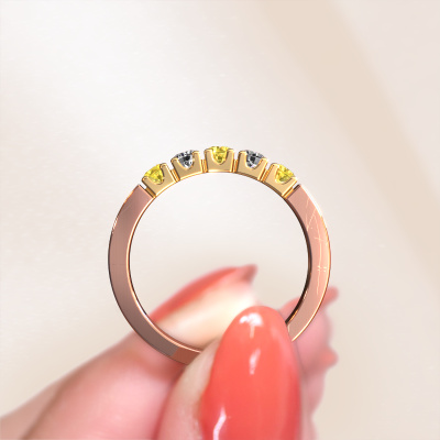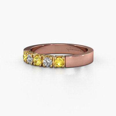 This extraordinary ring is called Dana 5. This type of ring is known as a memoire ring, because its gemstones are set in a continuous line. This makes it easy to combine with other rings. The band of this 14 Carat rose gold ring is set in a combination of yellow sapphire and diamond 3 mm. You can easily choose the combination you prefer online. As you can see, a single yellow sapphire is set in this single alliance rose gold ring. The memoire ring represents collaboration. And that is precisely what these gemstones do, collaborate. Together they add a beautiful effect to the band of a modern ring! Such a meaningful ring, wouldn't you agree? All of our hand selected yellow sapphire are positioned by hand by our expert goldsmith. It's a precise task, which can only be completed successfully through the combination of pure craftsmanship and usage of the latest techniques which give it an optimal effect. To create a perfect reflection of light, all the gemstones have to be perfectly aligned in the same way. During manufacturing, the expert goldsmith will therefore monitor the reflection of light constantly to check whether the yellow sapphire are aligned properly. This requires a skilled hand and a lot of patience but then the end product will be a true piece of art. And that is our mission!Because we design and deliver our own rings, we can offer you a ring at a price you won't find anywhere else. A ring is made to order, which helps prevent excess supplies, so we can make you a great price offer. We understand it feels risky, buying your ring online, but we will gladly assist in the designing process, taking your budget into consideration.New jewelry designs are added to our online collection daily. Our team of passionate designers strive to create extraordinary and diverse designs. Have you seen a ring you like? Please feel free to contact us. Based on a good price/ quality ratio, we will make you an offer you can't refuse!To make it easier for you, we offer a 30 day return policy. Check our terms and conditions.