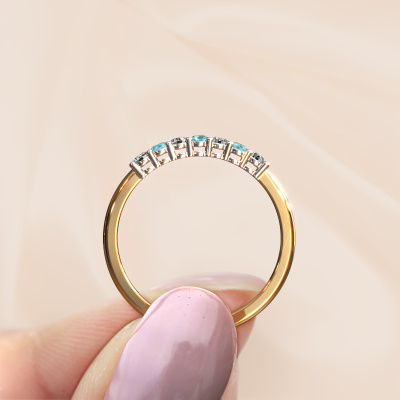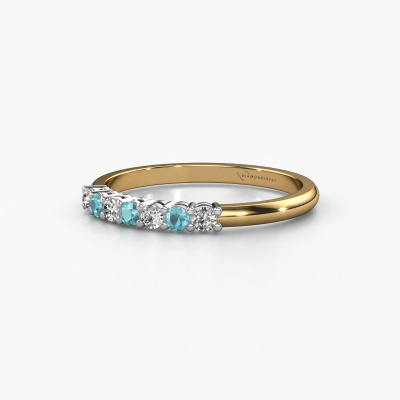 This extraordinary ring is called Michelle 7. This type of ring is known as a memoire ring, because its gemstones are set in a continuous line. This makes it easy to combine with other rings. The band of this 14 Carat gold ring is set in a combination of blue topaz and diamond 2 mm. You can easily choose the combination you prefer online. As you can see, a single blue topaz is set in this single alliance gold ring. The memoire ring represents collaboration. And that is precisely what these gemstones do, collaborate. Together they add a beautiful effect to the band of a classic ring! Such a meaningful ring, wouldn't you agree? All of our hand selected blue topaz are positioned by hand by our expert goldsmith. It's a precise task, which can only be completed successfully through the combination of pure craftsmanship and usage of the latest techniques which give it an optimal effect. To create a perfect reflection of light, all the gemstones have to be perfectly aligned in the same way. During manufacturing, the expert goldsmith will therefore monitor the reflection of light constantly to check whether the blue topaz are aligned properly. This requires a skilled hand and a lot of patience but then the end product will be a true piece of art. And that is our mission!After receiving your order, our goldsmiths will passionately start the creative process of making your ring in our own studio. Because we don't have a big stockpile, these costs will not be passed on to you. Our pricing is proof of that! We offer top quality jewels at lowest price, guaranteed.