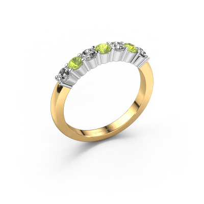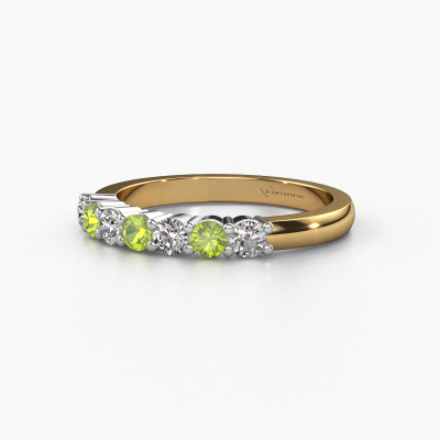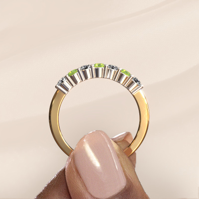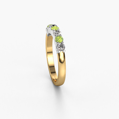 This extraordinary ring is called Yasmin 7. This type of ring is known as a memoire ring, because its gemstones are set in a continuous line. This makes it easy to combine with other rings. The band of this 14 Carat gold ring is set in a combination of peridot and lab-grown diamond 2.7 mm. You can easily choose the combination you prefer online. As you can see, a single peridot is set in this single alliance gold ring. The memoire ring represents collaboration. And that is precisely what these gemstones do, collaborate. Together they add a beautiful effect to the band of a classic ring! Such a meaningful ring, wouldn't you agree? All of our hand selected peridot are positioned by hand by our expert goldsmith. It's a precise task, which can only be completed successfully through the combination of pure craftsmanship and usage of the latest techniques which give it an optimal effect. To create a perfect reflection of light, all the gemstones have to be perfectly aligned in the same way. During manufacturing, the expert goldsmith will therefore monitor the reflection of light constantly to check whether the peridot are aligned properly. This requires a skilled hand and a lot of patience but then the end product will be a true piece of art. And that is our mission!After receiving your order, our goldsmiths will passionately start the creative process of making your ring in our own studio. Because we don't have a big stockpile, these costs will not be passed on to you. Our pricing is proof of that! We offer top quality jewels at lowest price, guaranteed.Our team of talented, passionate designers add new ring designs to our online collection daily. Our objective in doing so, is to be able to offer you a wide variety of jewels. Please feel free to request a quote if you have specific wishes for your ring. We guarantee to make you an offer you can't refuse.To make it easier for you, we offer a 30 day return policy. Check our terms and conditions.