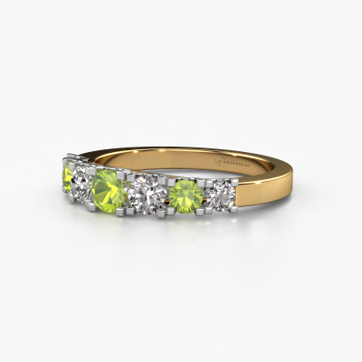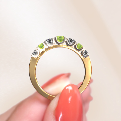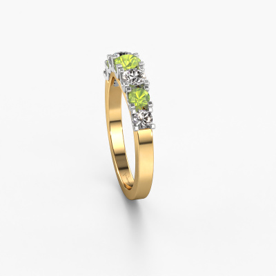 This extraordinary ring is called Selina 3. This type of ring is known as a memoire ring, because its gemstones are set in a continuous line. This makes it easy to combine with other rings. The band of this 14 Carat gold ring is set in a combination of peridot and diamond 3.7 mm. You can easily choose the combination you prefer online. As you can see, a single peridot is set in this single alliance gold ring. The memoire ring represents collaboration. And that is precisely what these gemstones do, collaborate. Together they add a beautiful effect to the band of a modern ring! Such a meaningful ring, wouldn't you agree? All of our hand selected peridot are positioned by hand by our expert goldsmith. It's a precise task, which can only be completed successfully through the combination of pure craftsmanship and usage of the latest techniques which give it an optimal effect. To create a perfect reflection of light, all the gemstones have to be perfectly aligned in the same way. During manufacturing, the expert goldsmith will therefore monitor the reflection of light constantly to check whether the peridot are aligned properly. This requires a skilled hand and a lot of patience but then the end product will be a true piece of art. And that is our mission!Because we design and deliver our own rings, we can offer you a ring at a price you won't find anywhere else. A ring is made to order, which helps prevent excess supplies, so we can make you a great price offer. We understand it feels risky, buying your ring online, but we will gladly assist in the designing process, taking your budget into consideration.Our team of talented, passionate designers add new ring designs to our online collection daily. Our objective in doing so, is to be able to offer you a wide variety of jewels. Please feel free to request a quote if you have specific wishes for your ring. We guarantee to make you an offer you can't refuse.To make it easier for you, we offer a 30 day return policy. Check our terms and conditions.