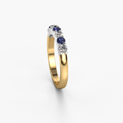 This extraordinary ring is called Yasmin 7. This type of ring is known as a memoire ring, because its gemstones are set in a continuous line. This makes it easy to combine with other rings. The band of this 14 Carat gold ring is set in a combination of sapphire and lab-grown diamond 2.7 mm. You can easily choose the combination you prefer online. As you can see, a single sapphire is set in this single alliance gold ring. The memoire ring represents collaboration. And that is precisely what these gemstones do, collaborate. Together they add a beautiful effect to the band of a classic ring! Such a meaningful ring, wouldn't you agree? All of our hand selected sapphire are positioned by hand by our expert goldsmith. It's a precise task, which can only be completed successfully through the combination of pure craftsmanship and usage of the latest techniques which give it an optimal effect. To create a perfect reflection of light, all the gemstones have to be perfectly aligned in the same way. During manufacturing, the expert goldsmith will therefore monitor the reflection of light constantly to check whether the sapphire are aligned properly. This requires a skilled hand and a lot of patience but then the end product will be a true piece of art. And that is our mission!After receiving your order, our goldsmiths will passionately start the creative process of making your ring in our own studio. Because we don't have a big stockpile, these costs will not be passed on to you. Our pricing is proof of that! We offer top quality jewels at lowest price, guaranteed.Our team of talented, passionate designers add new ring designs to our online collection daily. Our objective in doing so, is to be able to offer you a wide variety of jewels. Please feel free to request a quote if you have specific wishes for your ring. We guarantee to make you an offer you can't refuse.To make it easier for you, we offer a 30 day return policy. Check our terms and conditions.