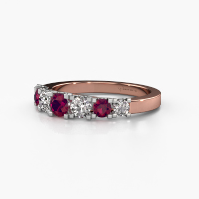 This extraordinary ring is called Selina 3. This type of ring is known as a memoire ring, because its gemstones are set in a continuous line. This makes it easy to combine with other rings. The band of this 14 Carat rose gold ring is set in a combination of rhodolite and diamond 3.7 mm. You can easily choose the combination you prefer online. As you can see, a single rhodolite is set in this single alliance rose gold ring. The memoire ring represents collaboration. And that is precisely what these gemstones do, collaborate. Together they add a beautiful effect to the band of a modern ring! Such a meaningful ring, wouldn't you agree? All of our hand selected rhodolite are positioned by hand by our expert goldsmith. It's a precise task, which can only be completed successfully through the combination of pure craftsmanship and usage of the latest techniques which give it an optimal effect. To create a perfect reflection of light, all the gemstones have to be perfectly aligned in the same way. During manufacturing, the expert goldsmith will therefore monitor the reflection of light constantly to check whether the rhodolite are aligned properly. This requires a skilled hand and a lot of patience but then the end product will be a true piece of art. And that is our mission!Because we design and deliver our own rings, we can offer you a ring at a price you won't find anywhere else. A ring is made to order, which helps prevent excess supplies, so we can make you a great price offer. We understand it feels risky, buying your ring online, but we will gladly assist in the designing process, taking your budget into consideration.Our team of talented, passionate designers add new ring designs to our online collection daily. Our objective in doing so, is to be able to offer you a wide variety of jewels. Please feel free to request a quote if you have specific wishes for your ring. We guarantee to make you an offer you can't refuse.To make it easier for you, we offer a 30 day return policy. Check our terms and conditions.