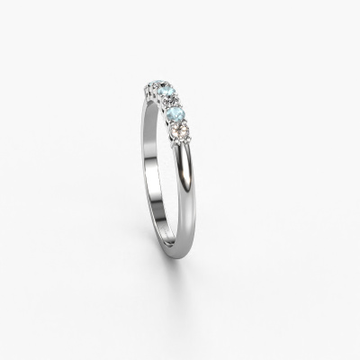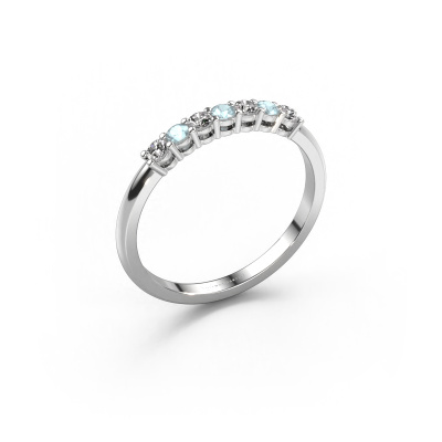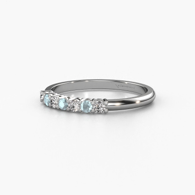 This extraordinary ring is called Michelle 7. This type of ring is known as a memoire ring, because its gemstones are set in a continuous line. This makes it easy to combine with other rings. The band of this 14 Carat white gold ring is set in a combination of aquamarine and diamond 2 mm. You can easily choose the combination you prefer online. As you can see, a single aquamarine is set in this single alliance white gold ring. The memoire ring represents collaboration. And that is precisely what these gemstones do, collaborate. Together they add a beautiful effect to the band of a classic ring! Such a meaningful ring, wouldn't you agree? All of our hand selected aquamarine are positioned by hand by our expert goldsmith. It's a precise task, which can only be completed successfully through the combination of pure craftsmanship and usage of the latest techniques which give it an optimal effect. To create a perfect reflection of light, all the gemstones have to be perfectly aligned in the same way. During manufacturing, the expert goldsmith will therefore monitor the reflection of light constantly to check whether the aquamarine are aligned properly. This requires a skilled hand and a lot of patience but then the end product will be a true piece of art. And that is our mission!After receiving your order, our goldsmiths will passionately start the creative process of making your ring in our own studio. Because we don't have a big stockpile, these costs will not be passed on to you. Our pricing is proof of that! We offer top quality jewels at lowest price, guaranteed.
