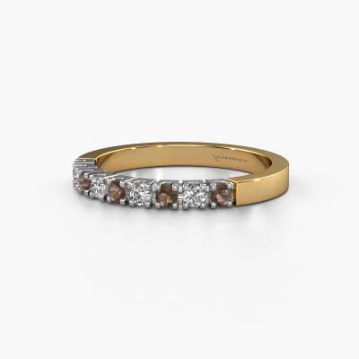 This extraordinary ring is called Dana 9. This type of ring is known as a memoire ring, because its gemstones are set in a continuous line. This makes it easy to combine with other rings. The band of this 14 Carat gold ring is set in a combination of smokey quartz and diamond 2 mm. You can easily choose the combination you prefer online. As you can see, a single smokey quartz is set in this single alliance gold ring. The memoire ring represents collaboration. And that is precisely what these gemstones do, collaborate. Together they add a beautiful effect to the band of a modern ring! Such a meaningful ring, wouldn't you agree? All of our hand selected smokey quartz are positioned by hand by our expert goldsmith. It's a precise task, which can only be completed successfully through the combination of pure craftsmanship and usage of the latest techniques which give it an optimal effect. To create a perfect reflection of light, all the gemstones have to be perfectly aligned in the same way. During manufacturing, the expert goldsmith will therefore monitor the reflection of light constantly to check whether the smokey quartz are aligned properly. This requires a skilled hand and a lot of patience but then the end product will be a true piece of art. And that is our mission!After receiving your order, our goldsmiths will passionately start the creative process of making your ring in our own studio. Because we don't have a big stockpile, these costs will not be passed on to you. Our pricing is proof of that! We offer top quality jewels at lowest price, guaranteed.Our talented designers add new designs to our online collection daily. Together they create a diverse collection of the finest jewelry. If you prefer to make a ring according your own design, please feel free to request a quote. We will make you an amazing offer, based on quality and price.To make it easier for you, we offer a 30 day return policy. Check our terms and conditions.