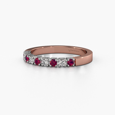 This extraordinary ring is called Dana 9. This type of ring is known as a memoire ring, because its gemstones are set in a continuous line. This makes it easy to combine with other rings. The band of this 14 Carat rose gold ring is set in a combination of rhodolite and diamond 2 mm. You can easily choose the combination you prefer online. As you can see, a single rhodolite is set in this single alliance rose gold ring. The memoire ring represents collaboration. And that is precisely what these gemstones do, collaborate. Together they add a beautiful effect to the band of a modern ring! Such a meaningful ring, wouldn't you agree? All of our hand selected rhodolite are positioned by hand by our expert goldsmith. It's a precise task, which can only be completed successfully through the combination of pure craftsmanship and usage of the latest techniques which give it an optimal effect. To create a perfect reflection of light, all the gemstones have to be perfectly aligned in the same way. During manufacturing, the expert goldsmith will therefore monitor the reflection of light constantly to check whether the rhodolite are aligned properly. This requires a skilled hand and a lot of patience but then the end product will be a true piece of art. And that is our mission!After receiving your order, our goldsmiths will passionately start the creative process of making your ring in our own studio. Because we don't have a big stockpile, these costs will not be passed on to you. Our pricing is proof of that! We offer top quality jewels at lowest price, guaranteed.Our talented designers add new designs to our online collection daily. Together they create a diverse collection of the finest jewelry. If you prefer to make a ring according your own design, please feel free to request a quote. We will make you an amazing offer, based on quality and price.To make it easier for you, we offer a 30 day return policy. Check our terms and conditions.