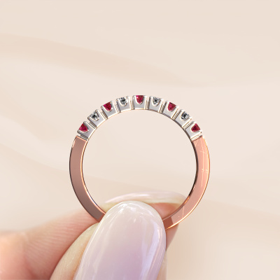 This extraordinary ring is called Dana 9. This type of ring is known as a memoire ring, because its gemstones are set in a continuous line. This makes it easy to combine with other rings. The band of this 14 Carat rose gold ring is set in a combination of ruby and diamond 2 mm. You can easily choose the combination you prefer online. As you can see, a single ruby is set in this single alliance rose gold ring. The memoire ring represents collaboration. And that is precisely what these gemstones do, collaborate. Together they add a beautiful effect to the band of a modern ring! Such a meaningful ring, wouldn't you agree? All of our hand selected ruby are positioned by hand by our expert goldsmith. It's a precise task, which can only be completed successfully through the combination of pure craftsmanship and usage of the latest techniques which give it an optimal effect. To create a perfect reflection of light, all the gemstones have to be perfectly aligned in the same way. During manufacturing, the expert goldsmith will therefore monitor the reflection of light constantly to check whether the ruby are aligned properly. This requires a skilled hand and a lot of patience but then the end product will be a true piece of art. And that is our mission!After receiving your order, our goldsmiths will passionately start the creative process of making your ring in our own studio. Because we don't have a big stockpile, these costs will not be passed on to you. Our pricing is proof of that! We offer top quality jewels at lowest price, guaranteed.Our talented designers add new designs to our online collection daily. Together they create a diverse collection of the finest jewelry. If you prefer to make a ring according your own design, please feel free to request a quote. We will make you an amazing offer, based on quality and price.To make it easier for you, we offer a 30 day return policy. Check our terms and conditions.