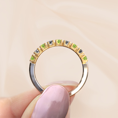 This extraordinary ring is called Rianne 9. This type of ring is known as a memoire ring, because its gemstones are set in a continuous line. This makes it easy to combine with other rings. The band of this 14 Carat white gold ring is set in a combination of peridot and diamond 2.4 mm. You can easily choose the combination you prefer online. As you can see, a single peridot is set in this single alliance white gold ring. The memoire ring represents collaboration. And that is precisely what these gemstones do, collaborate. Together they add a beautiful effect to the band of a classic ring! Such a meaningful ring, wouldn't you agree? All of our hand selected peridot are positioned by hand by our expert goldsmith. It's a precise task, which can only be completed successfully through the combination of pure craftsmanship and usage of the latest techniques which give it an optimal effect. To create a perfect reflection of light, all the gemstones have to be perfectly aligned in the same way. During manufacturing, the expert goldsmith will therefore monitor the reflection of light constantly to check whether the peridot are aligned properly. This requires a skilled hand and a lot of patience but then the end product will be a true piece of art. And that is our mission!Are you on a budget? Please feel free to contact us, so we can go discuss your options. We offer our rings at guaranteed best price, because we make them to order. You won't find such a price anywhere else!