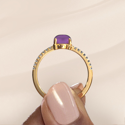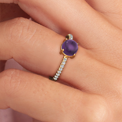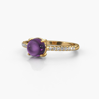 In this photo the gold Cathie ring is set with a cabochon amethyst. Cabochon means a amethyst is shaped first, not faceted, into a specific shape, such as a drop, heart or round cabochon. Subsequently, it is polished until the gemstone has a orb shaped surface. A cabochon gemstone is a stunning, classy eye-catcher that matches perfectly with a contemporary as well as a vintage style. Our expert goldsmiths shape the birthstones ring to perfection which makes it unique. The cabochon amethyst is set so its unique qualities are strengthened. How do you like this trendy gold ring? Simply customize this Cathie ring, using our online tool. Subsequently, your personal birthstones Cathie ring will be made by hand by our goldsmiths. Precious metals and gemstones can be customized to your liking. Do you have specific preferences which are unavailable in our online tool? Please feel free to contact us. We will customize your personal trendy ring to your liking.By using our modern techniques, we can design and customize the finest quality jewels with the utmost care for you. Our rings are always priced 30 percent lower than other jewelers. We make rings to order, so we don't have to maintain a large stock. If you have a certain budget, we are more than happy to advice you accordingly.To make it easier for you, we offer a 30 day return policy. Check our terms and conditions.