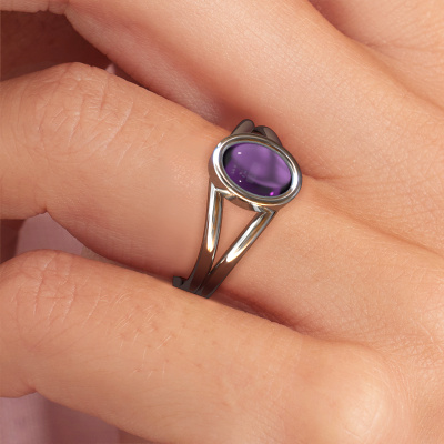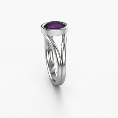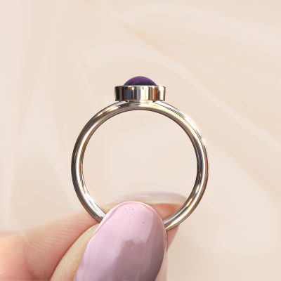In this photo the platinum Lieselotte ring is set with a cabochon amethyst. Cabochon means a amethyst is shaped first, not faceted, into a specific shape, such as a drop, heart or oval cabochon. Subsequently, it is polished until the gemstone has a orb shaped surface. A cabochon gemstone is a stunning, classy eye-catcher that matches perfectly with a contemporary as well as a vintage style. Our expert goldsmiths shape the charming ring to perfection which makes it unique. The cabochon amethyst is set so its unique qualities are strengthened. How do you like this fantasy platinum ring? Simply customize this Lieselotte ring, using our online tool. Subsequently, your personal charming Lieselotte ring will be made by hand by our goldsmiths. Precious metals and gemstones can be customized to your liking. Do you have specific preferences which are unavailable in our online tool? Please feel free to contact us. We will customize your personal fantasy ring to your liking.After receiving your order, our goldsmiths will passionately start the creative process of making your ring in our own studio. Because we don't have a big stockpile, these costs will not be passed on to you. Our pricing is proof of that! We offer top quality jewels at lowest price, guaranteed.To make it easier for you, we offer a 30 day return policy. Check our terms and conditions.