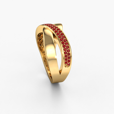 This ring called Denisse is made of 14 Carat gold and is set with ruby. Are you in the market for a unique gold ring with a modern twist? Then this ring might suit you. Simply customize to your or her liking. It suits the contemporary modern woman. This beautiful ring is set with beautiful ruby. This has been carefully selected. Because your ring must be adorned with nothing but the most stunning gemstone. Our expert goldsmith will create your ring in our own studio, where the ruby will be set with great care. The ring will then be polished to perfection to create a stunning ring. Because we design and deliver our own rings, we can offer you a ring at a price you won't find anywhere else. A ring is made to order, which helps prevent excess supplies, so we can make you a great price offer. We understand it feels risky, buying your ring online, but we will gladly assist in the designing process, taking your budget into consideration.Our team of talented, passionate designers add new ring designs to our online collection daily. Our objective in doing so, is to be able to offer you a wide variety of jewels. Please feel free to request a quote if you have specific wishes for your ring. We guarantee to make you an offer you can't refuse.To make it easier for you, we offer a 30 day return policy. Check our terms and conditions.