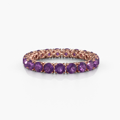 This is our Vivienne 2.9 ring. This specific type is called an eternity ring and it is set with a continuous line of identically cut gemstones. The ring is made in 14 Carat rose gold and is set with small amethysten, 2.9 mm. This rose gold Eternity ring is a perfectly beautiful and meaningful way to give your proposal that special touch. The magnificent evenly shaped amethysten are pave set around the ring. The identical amethysten are carefully selected to give the ring a maximum effect. Do keep in mind we use natural resources so small differences between stones are common. The special effect is enhanced due to precise positioning of the amethysten. This requires the utmost precision and a skillful hand but for our skilled artisans this is what excites them. The result is a ring with a row of amethysten which seem to have no beginning nor end. The perfect symbol of your love for her! Isn't she a beauty?By using our modern techniques, we can design and customize the finest quality jewels with the utmost care for you. Our rings are always priced 30 percent lower than other jewelers. We make rings to order, so we don't have to maintain a large stock. If you have a certain budget, we are more than happy to advice you accordingly.New jewelry designs are added to our online collection daily. Our team of passionate designers strive to create extraordinary and diverse designs. Have you seen a ring you like? Please feel free to contact us. Based on a good price/ quality ratio, we will make you an offer you can't refuse!To make it easier for you, we offer a 30 day return policy. Check our terms and conditions.