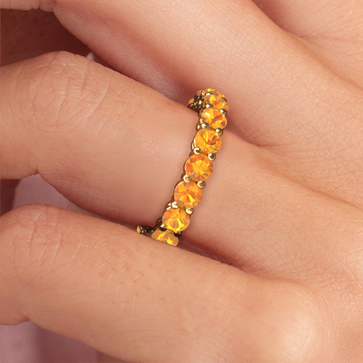 This is our Michelle full 3.4 ring. This specific type is called an eternity ring and it is set with a continuous line of identically cut gemstones. The ring is made in 14 Carat gold and is set with small citrin, 3.4 mm. This gold Eternity ring is a perfectly beautiful and meaningful way to give your proposal that special touch. The magnificent evenly shaped citrin are pave set around the ring. The identical citrin are carefully selected to give the ring a maximum effect. Do keep in mind we use natural resources so small differences between stones are common. The special effect is enhanced due to precise positioning of the citrin. This requires the utmost precision and a skillful hand but for our skilled artisans this is what excites them. The result is a stackable ring with a row of citrin which seem to have no beginning nor end. The perfect symbol of your love for her! Isn't she a beauty?By using a combination of the latest modern techniques, combined with ancient crafting, we can make all our rings in our own studio. Each jewel is made to order. This is advantageous because we can offer you a price you won't find anywhere else.New jewelry designs are added to our online collection daily. Our team of passionate designers strive to create extraordinary and diverse designs. Have you seen a ring you like? Please feel free to contact us. Based on a good price/ quality ratio, we will make you an offer you can't refuse!To make it easier for you, we offer a 30 day return policy. Check our terms and conditions.