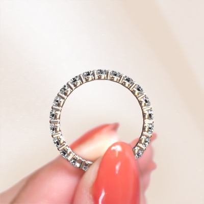 This is our Heddy rnd 2.7 ring. This specific type is called an eternity ring and it is set with a continuous line of identically cut gemstones. The ring is made in 14 Carat white gold and is set with small diamonds, 0.08 crt. This white gold Eternity ring is a perfectly beautiful and meaningful way to give your proposal that special touch. The magnificent evenly shaped diamonds are pave set around the ring. The identical diamonds are carefully selected to give the ring a maximum effect. Do keep in mind we use natural resources so small differences between stones are common. The special effect is enhanced due to precise positioning of the diamonds. This requires the utmost precision and a skillful hand but for our skilled artisans this is what excites them. The result is a stackable ring with a row of diamonds which seem to have no beginning nor end. The perfect symbol of your love for her! Isn't she a beauty?Because we design and deliver our own rings, we can offer you a ring at a price you won't find anywhere else. A ring is made to order, which helps prevent excess supplies, so we can make you a great price offer. We understand it feels risky, buying your ring online, but we will gladly assist in the designing process, taking your budget into consideration.Our team of talented, passionate designers add new ring designs to our online collection daily. Our objective in doing so, is to be able to offer you a wide variety of jewels. Please feel free to request a quote if you have specific wishes for your ring. We guarantee to make you an offer you can't refuse.To make it easier for you, we offer a 30 day return policy. Check our terms and conditions.