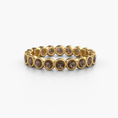 This is our Mariam 0.05 ring. This specific type is called an eternity ring and it is set with a continuous line of identically cut gemstones. The ring is made in 14 Carat gold and is set with small smokey quartz, 2.4 mm. The amazing smokey quartz are identical in size and are set in the ring band. Our smokey quartz are selected with great care so they are identical, which gives the best result. In order to get the best result, our artisans position all smokey quartz by hand with the utmost care. Our Goldsmiths have one ambition, which is creating the perfect ring. That is why we love what we do. In the end you get a stunning modern gold ring with a row of smokey quartz which seem to have no beginning nor end. The perfect symbol of your undying love for her! How special is that!By using a combination of the latest modern techniques, combined with ancient crafting, we can make all our rings in our own studio. Each jewel is made to order. This is advantageous because we can offer you a price you won't find anywhere else.