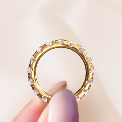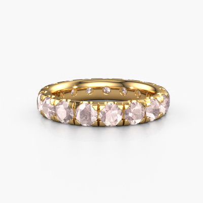 This is our Jackie 3.7 ring. This specific type is called an eternity ring and it is set with a continuous line of identically cut gemstones. The ring is made in 14 Carat gold and is set with small morganite champagne, 3.7 mm. The amazing morganite champagne are identical in size and are set in the ring band. Our morganite champagne are selected with great care so they are identical, which gives the best result. In order to get the best result, our artisans position all morganite champagne by hand with the utmost care. Our Goldsmiths have one ambition, which is creating the perfect ring. That is why we love what we do. In the end you get a stunning exclusive gold stackable ring with a row of morganite champagne which seem to have no beginning nor end. The perfect symbol of your undying love for her! How special is that!