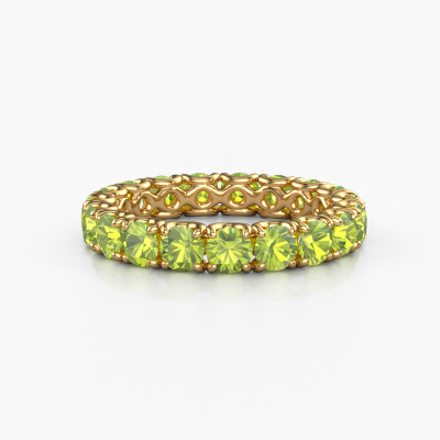 This is our Estee 3.4 ring. This specific type is called an eternity ring and it is set with a continuous line of identically cut gemstones. The ring is made in 14 Carat gold and is set with small peridot, 3.4 mm. The amazing peridot are identical in size and are set in the ring band. Our peridot are selected with great care so they are identical, which gives the best result. In order to get the best result, our artisans position all peridot by hand with the utmost care. Our Goldsmiths have one ambition, which is creating the perfect ring. That is why we love what we do. In the end you get a stunning modern gold stackable ring with a row of peridot which seem to have no beginning nor end. The perfect symbol of your undying love for her! How special is that!By using a combination of the latest modern techniques, combined with ancient crafting, we can make all our rings in our own studio. Each jewel is made to order. This is advantageous because we can offer you a price you won't find anywhere else.