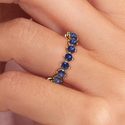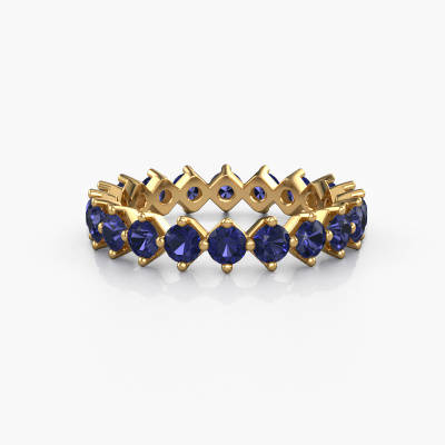 This is our Janie 3.0mm ring. This specific type is called an eternity ring and it is set with a continuous line of identically cut gemstones. The ring is made in 14 Carat gold and is set with small sapphire, 3 mm. The amazing sapphire are identical in size and are set in the ring band. Our sapphire are selected with great care so they are identical, which gives the best result. In order to get the best result, our artisans position all sapphire by hand with the utmost care. Our Goldsmiths have one ambition, which is creating the perfect ring. That is why we love what we do. In the end you get a stunning fantasy gold stackable ring with a row of sapphire which seem to have no beginning nor end. The perfect symbol of your undying love for her! How special is that!By using a combination of the latest modern techniques, combined with ancient crafting, we can make all our rings in our own studio. Each jewel is made to order. This is advantageous because we can offer you a price you won't find anywhere else.