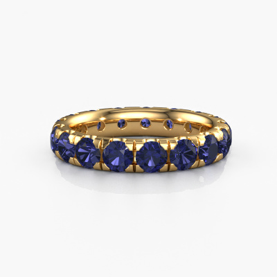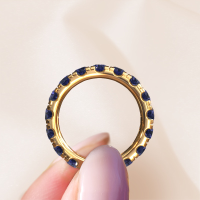 This is our Jackie 3.7 ring. This specific type is called an eternity ring and it is set with a continuous line of identically cut gemstones. The ring is made in 14 Carat gold and is set with small sapphire, 3.7 mm. The amazing sapphire are identical in size and are set in the ring band. Our sapphire are selected with great care so they are identical, which gives the best result. In order to get the best result, our artisans position all sapphire by hand with the utmost care. Our Goldsmiths have one ambition, which is creating the perfect ring. That is why we love what we do. In the end you get a stunning modern gold stackable ring with a row of sapphire which seem to have no beginning nor end. The perfect symbol of your undying love for her! How special is that!By using our modern techniques, we can design and customize the finest quality jewels with the utmost care for you. Our rings are always priced 30 percent lower than other jewelers. We make rings to order, so we don't have to maintain a large stock. If you have a certain budget, we are more than happy to advice you accordingly.New jewelry designs are added to our online collection daily. Our team of passionate designers strive to create extraordinary and diverse designs. Have you seen a ring you like? Please feel free to contact us. Based on a good price/ quality ratio, we will make you an offer you can't refuse!To make it easier for you, we offer a 30 day return policy. Check our terms and conditions.