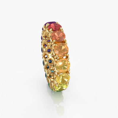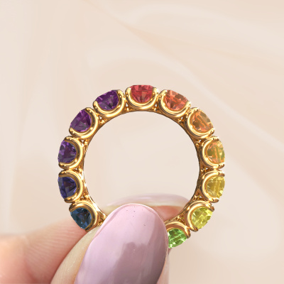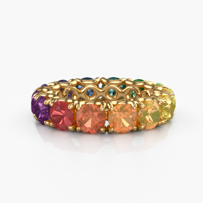 This is our Estee 4.7 ring. This specific type is called an eternity ring and it is set with a continuous line of identically cut gemstones. The ring is made in 14 Carat gold and is set with small Rainbow sapphire 1, 4.7 mm. This gold Eternity ring is a perfectly beautiful and meaningful way to give your proposal that special touch. The magnificent evenly shaped Rainbow sapphire 1 are pave set around the ring. The identical Rainbow sapphire 1 are carefully selected to give the ring a maximum effect. Do keep in mind we use natural resources so small differences between stones are common. The special effect is enhanced due to precise positioning of the Rainbow sapphire 1. This requires the utmost precision and a skillful hand but for our skilled artisans this is what excites them. The result is a ring with a row of Rainbow sapphire 1 which seem to have no beginning nor end. The perfect symbol of your love for her! Isn't she a beauty?By using our modern techniques, we can design and customize the finest quality jewels with the utmost care for you. Our rings are always priced 30 percent lower than other jewelers. We make rings to order, so we don't have to maintain a large stock. If you have a certain budget, we are more than happy to advice you accordingly.