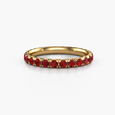This is our Jackie 2.3 ring. This specific type is called an eternity ring and it is set with a continuous line of identically cut gemstones. The ring is made in 14 Carat gold and is set with small ruby, 2.3 mm. The amazing ruby are identical in size and are set in the ring band. Our ruby are selected with great care so they are identical, which gives the best result. In order to get the best result, our artisans position all ruby by hand with the utmost care. Our Goldsmiths have one ambition, which is creating the perfect ring. That is why we love what we do. In the end you get a stunning modern gold ring with a row of ruby which seem to have no beginning nor end. The perfect symbol of your undying love for her! How special is that!Are you on a budget? Please feel free to contact us, so we can go discuss your options. We offer our rings at guaranteed best price, because we make them to order. You won't find such a price anywhere else!Our team of talented, passionate designers add new ring designs to our online collection daily. Our objective in doing so, is to be able to offer you a wide variety of jewels. Please feel free to request a quote if you have specific wishes for your ring. We guarantee to make you an offer you can't refuse.To make it easier for you, we offer a 30 day return policy. Check our terms and conditions.