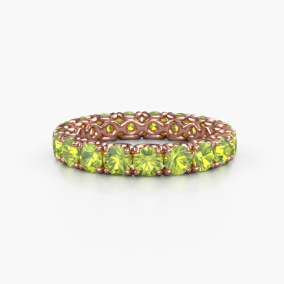 This is our Estee 3.4 ring. This specific type is called an eternity ring and it is set with a continuous line of identically cut gemstones. The ring is made in 14 Carat rose gold and is set with small peridot, 3.4 mm. The amazing peridot are identical in size and are set in the ring band. Our peridot are selected with great care so they are identical, which gives the best result. In order to get the best result, our artisans position all peridot by hand with the utmost care. Our Goldsmiths have one ambition, which is creating the perfect ring. That is why we love what we do. In the end you get a stunning modern rose gold stackable ring with a row of peridot which seem to have no beginning nor end. The perfect symbol of your undying love for her! How special is that!By using a combination of the latest modern techniques, combined with ancient crafting, we can make all our rings in our own studio. Each jewel is made to order. This is advantageous because we can offer you a price you won't find anywhere else.