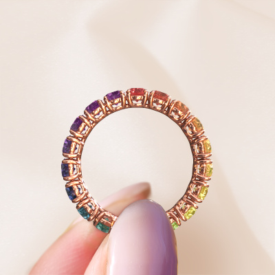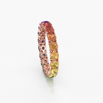 This is our Vivienne 3.4 ring. This specific type is called an eternity ring and it is set with a continuous line of identically cut gemstones. The ring is made in 14 Carat rose gold and is set with small Rainbow sapphire 1, 3.4 mm. The amazing Rainbow sapphire 1 are identical in size and are set in the ring band. Our Rainbow sapphire 1 are selected with great care so they are identical, which gives the best result. In order to get the best result, our artisans position all Rainbow sapphire 1 by hand with the utmost care. Our Goldsmiths have one ambition, which is creating the perfect ring. That is why we love what we do. In the end you get a stunning classic rose gold stackable ring with a row of Rainbow sapphire 1 which seem to have no beginning nor end. The perfect symbol of your undying love for her! How special is that!Are you on a budget? Please feel free to contact us, so we can go discuss your options. We offer our rings at guaranteed best price, because we make them to order. You won't find such a price anywhere else!Our team of talented, passionate designers add new ring designs to our online collection daily. Our objective in doing so, is to be able to offer you a wide variety of jewels. Please feel free to request a quote if you have specific wishes for your ring. We guarantee to make you an offer you can't refuse.To make it easier for you, we offer a 30 day return policy. Check our terms and conditions.