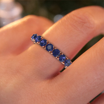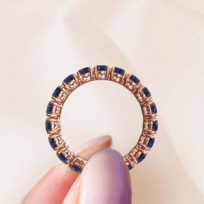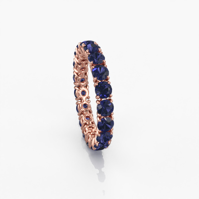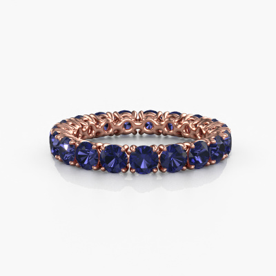 This is our Vivienne 3.4 ring. This specific type is called an eternity ring and it is set with a continuous line of identically cut gemstones. The ring is made in 14 Carat rose gold and is set with small sapphire, 3.4 mm. The amazing sapphire are identical in size and are set in the ring band. Our sapphire are selected with great care so they are identical, which gives the best result. In order to get the best result, our artisans position all sapphire by hand with the utmost care. Our Goldsmiths have one ambition, which is creating the perfect ring. That is why we love what we do. In the end you get a stunning classic rose gold stackable ring with a row of sapphire which seem to have no beginning nor end. The perfect symbol of your undying love for her! How special is that!Are you on a budget? Please feel free to contact us, so we can go discuss your options. We offer our rings at guaranteed best price, because we make them to order. You won't find such a price anywhere else!Our team of talented, passionate designers add new ring designs to our online collection daily. Our objective in doing so, is to be able to offer you a wide variety of jewels. Please feel free to request a quote if you have specific wishes for your ring. We guarantee to make you an offer you can't refuse.To make it easier for you, we offer a 30 day return policy. Check our terms and conditions.