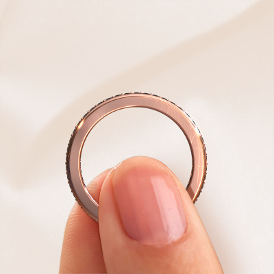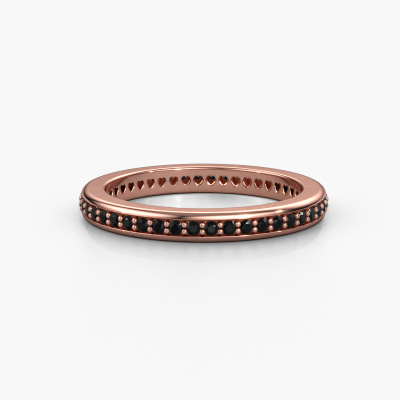 This is our Elvire 2 ring. This specific type is called an eternity ring and it is set with a continuous line of identically cut gemstones. The ring is made in 14 Carat rose gold and is set with small black diamonds, 0.414 crt. The amazing black diamonds are identical in size and are set in the ring band. Our black diamonds are selected with great care so they are identical, which gives the best result. In order to get the best result, our artisans position all black diamonds by hand with the utmost care. Our Goldsmiths have one ambition, which is creating the perfect ring. That is why we love what we do. In the end you get a stunning modern rose gold stackable ring with a row of black diamonds which seem to have no beginning nor end. The perfect symbol of your undying love for her! How special is that!Are you on a budget? Please feel free to contact us, so we can go discuss your options. We offer our rings at guaranteed best price, because we make them to order. You won't find such a price anywhere else!New jewelry designs are added to our online collection daily. Our team of passionate designers strive to create extraordinary and diverse designs. Have you seen a ring you like? Please feel free to contact us. Based on a good price/ quality ratio, we will make you an offer you can't refuse!To make it easier for you, we offer a 30 day return policy. Check our terms and conditions.