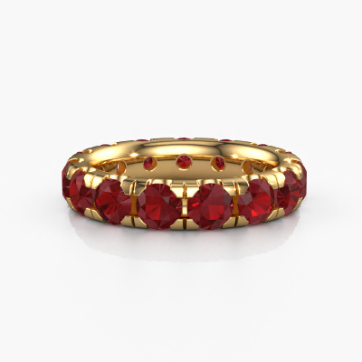 This is our Jackie 4.2 ring. This specific type is called an eternity ring and it is set with a continuous line of identically cut gemstones. The ring is made in 14 Carat gold and is set with small ruby, 4.2 mm. This gold Eternity ring is a perfectly beautiful and meaningful way to give your proposal that special touch. The magnificent evenly shaped ruby are pave set around the ring. The identical ruby are carefully selected to give the ring a maximum effect. Do keep in mind we use natural resources so small differences between stones are common. The special effect is enhanced due to precise positioning of the ruby. This requires the utmost precision and a skillful hand but for our skilled artisans this is what excites them. The result is a stackable ring with a row of ruby which seem to have no beginning nor end. The perfect symbol of your love for her! Isn't she a beauty?After receiving your order, our goldsmiths will start the creative process of making your Jackie 4.2 ring. We don't keep stock. This is advantageous because these costs will not be passed on to you. Therefore, we can offer jewelry at exceptionally low prices.New jewelry designs are added to our online collection daily. Our team of passionate designers strive to create extraordinary and diverse designs. Have you seen a ring you like? Please feel free to contact us. Based on a good price/ quality ratio, we will make you an offer you can't refuse!To make it easier for you, we offer a 30 day return policy. Check our terms and conditions.
