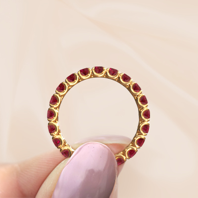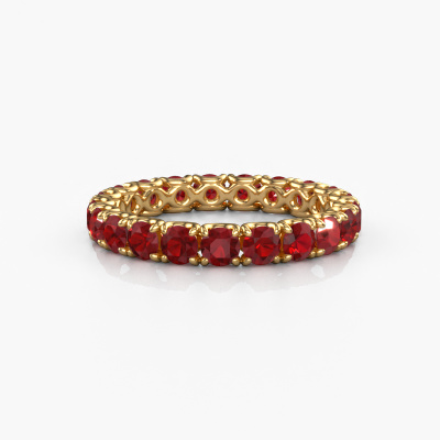 This is our Estee 2.9 ring. This specific type is called an eternity ring and it is set with a continuous line of identically cut gemstones. The ring is made in 14 Carat gold and is set with small ruby, 2.9 mm. This gold Eternity ring is a perfectly beautiful and meaningful way to give your proposal that special touch. The magnificent evenly shaped ruby are pave set around the ring. The identical ruby are carefully selected to give the ring a maximum effect. Do keep in mind we use natural resources so small differences between stones are common. The special effect is enhanced due to precise positioning of the ruby. This requires the utmost precision and a skillful hand but for our skilled artisans this is what excites them. The result is a stackable ring with a row of ruby which seem to have no beginning nor end. The perfect symbol of your love for her! Isn't she a beauty?Because we design and deliver our own rings, we can offer you a ring at a price you won't find anywhere else. A ring is made to order, which helps prevent excess supplies, so we can make you a great price offer. We understand it feels risky, buying your ring online, but we will gladly assist in the designing process, taking your budget into consideration.Our team of talented, passionate designers add new ring designs to our online collection daily. Our objective in doing so, is to be able to offer you a wide variety of jewels. Please feel free to request a quote if you have specific wishes for your ring. We guarantee to make you an offer you can't refuse.To make it easier for you, we offer a 30 day return policy. Check our terms and conditions.