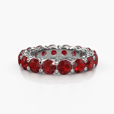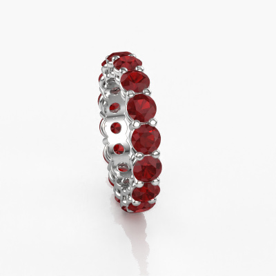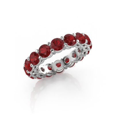 This is our Michelle full 4.2 ring. This specific type is called an eternity ring and it is set with a continuous line of identically cut gemstones. The ring is made in 14 Carat white gold and is set with small ruby, 4.2 mm. This white gold Eternity ring is a perfectly beautiful and meaningful way to give your proposal that special touch. The magnificent evenly shaped ruby are pave set around the ring. The identical ruby are carefully selected to give the ring a maximum effect. Do keep in mind we use natural resources so small differences between stones are common. The special effect is enhanced due to precise positioning of the ruby. This requires the utmost precision and a skillful hand but for our skilled artisans this is what excites them. The result is a stackable ring with a row of ruby which seem to have no beginning nor end. The perfect symbol of your love for her! Isn't she a beauty?After receiving your order, our goldsmiths will start the creative process of making your Michelle full 4.2 ring. We don't keep stock. This is advantageous because these costs will not be passed on to you. Therefore, we can offer jewelry at exceptionally low prices.New jewelry designs are added to our online collection daily. Our team of passionate designers strive to create extraordinary and diverse designs. Have you seen a ring you like? Please feel free to contact us. Based on a good price/ quality ratio, we will make you an offer you can't refuse!To make it easier for you, we offer a 30 day return policy. Check our terms and conditions.