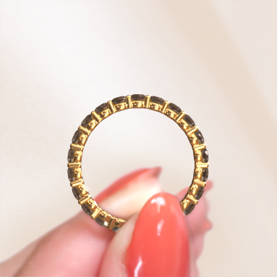 This is our Heddy rnd 2.7 ring. This specific type is called an eternity ring and it is set with a continuous line of identically cut gemstones. The ring is made in 14 Carat gold and is set with small smokey quartz, 2.7 mm. This gold Eternity ring is a perfectly beautiful and meaningful way to give your proposal that special touch. The magnificent evenly shaped smokey quartz are pave set around the ring. The identical smokey quartz are carefully selected to give the ring a maximum effect. Do keep in mind we use natural resources so small differences between stones are common. The special effect is enhanced due to precise positioning of the smokey quartz. This requires the utmost precision and a skillful hand but for our skilled artisans this is what excites them. The result is a stackable ring with a row of smokey quartz which seem to have no beginning nor end. The perfect symbol of your love for her! Isn't she a beauty?Because we design and deliver our own rings, we can offer you a ring at a price you won't find anywhere else. A ring is made to order, which helps prevent excess supplies, so we can make you a great price offer. We understand it feels risky, buying your ring online, but we will gladly assist in the designing process, taking your budget into consideration.Our team of talented, passionate designers add new ring designs to our online collection daily. Our objective in doing so, is to be able to offer you a wide variety of jewels. Please feel free to request a quote if you have specific wishes for your ring. We guarantee to make you an offer you can't refuse.To make it easier for you, we offer a 30 day return policy. Check our terms and conditions.