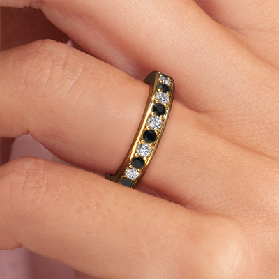 This is our Nienke ring. This specific type is called an eternity ring and it is set with a continuous line of identically cut gemstones. The ring is made in 14 Carat gold and is set with small black diamonds, 1.386 crt. The amazing black diamonds are identical in size and are set in the ring band. Our black diamonds are selected with great care so they are identical, which gives the best result. In order to get the best result, our artisans position all black diamonds by hand with the utmost care. Our Goldsmiths have one ambition, which is creating the perfect ring. That is why we love what we do. In the end you get a stunning modern gold stackable ring with a row of black diamonds which seem to have no beginning nor end. The perfect symbol of your undying love for her! How special is that!After receiving your order, our goldsmiths will start the creative process of making your Nienke ring. We don't keep stock. This is advantageous because these costs will not be passed on to you. Therefore, we can offer jewelry at exceptionally low prices.Our team of talented, passionate designers add new ring designs to our online collection daily. Our objective in doing so, is to be able to offer you a wide variety of jewels. Please feel free to request a quote if you have specific wishes for your ring. We guarantee to make you an offer you can't refuse.To make it easier for you, we offer a 30 day return policy. Check our terms and conditions.