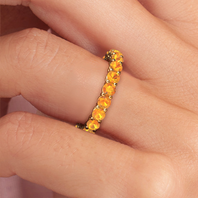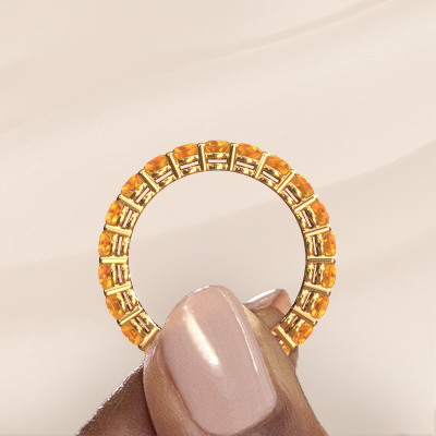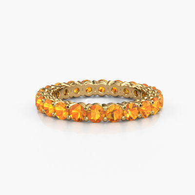 This is our Michelle full 3.0 ring. This specific type is called an eternity ring and it is set with a continuous line of identically cut gemstones. The ring is made in 14 Carat gold and is set with small citrin, 3 mm. The amazing citrin are identical in size and are set in the ring band. Our citrin are selected with great care so they are identical, which gives the best result. In order to get the best result, our artisans position all citrin by hand with the utmost care. Our Goldsmiths have one ambition, which is creating the perfect ring. That is why we love what we do. In the end you get a stunning classic gold stackable ring with a row of citrin which seem to have no beginning nor end. The perfect symbol of your undying love for her! How special is that!Because we design and deliver our own rings, we can offer you a ring at a price you won't find anywhere else. A ring is made to order, which helps prevent excess supplies, so we can make you a great price offer. We understand it feels risky, buying your ring online, but we will gladly assist in the designing process, taking your budget into consideration.Our talented designers add new designs to our online collection daily. Together they create a diverse collection of the finest jewelry. If you prefer to make a ring according your own design, please feel free to request a quote. We will make you an amazing offer, based on quality and price.To make it easier for you, we offer a 30 day return policy. Check our terms and conditions.