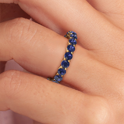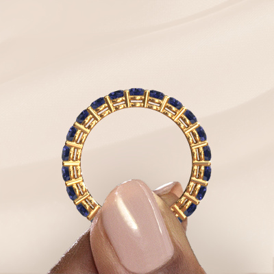 This is our Michelle full 3.0 ring. This specific type is called an eternity ring and it is set with a continuous line of identically cut gemstones. The ring is made in 14 Carat gold and is set with small sapphire, 3 mm. The amazing sapphire are identical in size and are set in the ring band. Our sapphire are selected with great care so they are identical, which gives the best result. In order to get the best result, our artisans position all sapphire by hand with the utmost care. Our Goldsmiths have one ambition, which is creating the perfect ring. That is why we love what we do. In the end you get a stunning classic gold stackable ring with a row of sapphire which seem to have no beginning nor end. The perfect symbol of your undying love for her! How special is that!Because we design and deliver our own rings, we can offer you a ring at a price you won't find anywhere else. A ring is made to order, which helps prevent excess supplies, so we can make you a great price offer. We understand it feels risky, buying your ring online, but we will gladly assist in the designing process, taking your budget into consideration.Our talented designers add new designs to our online collection daily. Together they create a diverse collection of the finest jewelry. If you prefer to make a ring according your own design, please feel free to request a quote. We will make you an amazing offer, based on quality and price.To make it easier for you, we offer a 30 day return policy. Check our terms and conditions.